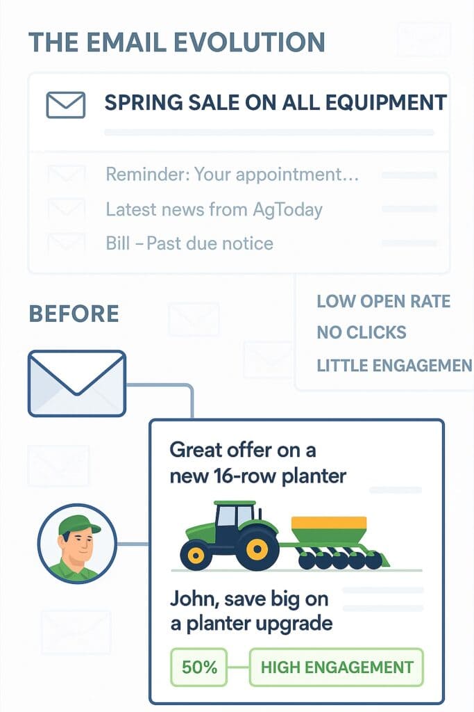 Traditional email marketing for equipment dealers often follows a “spray and pray” approach. You send the same general message to your entire database and hope someone responds. Open rates hover around 15-20% if you’re lucky, and click-through rates are abysmal.