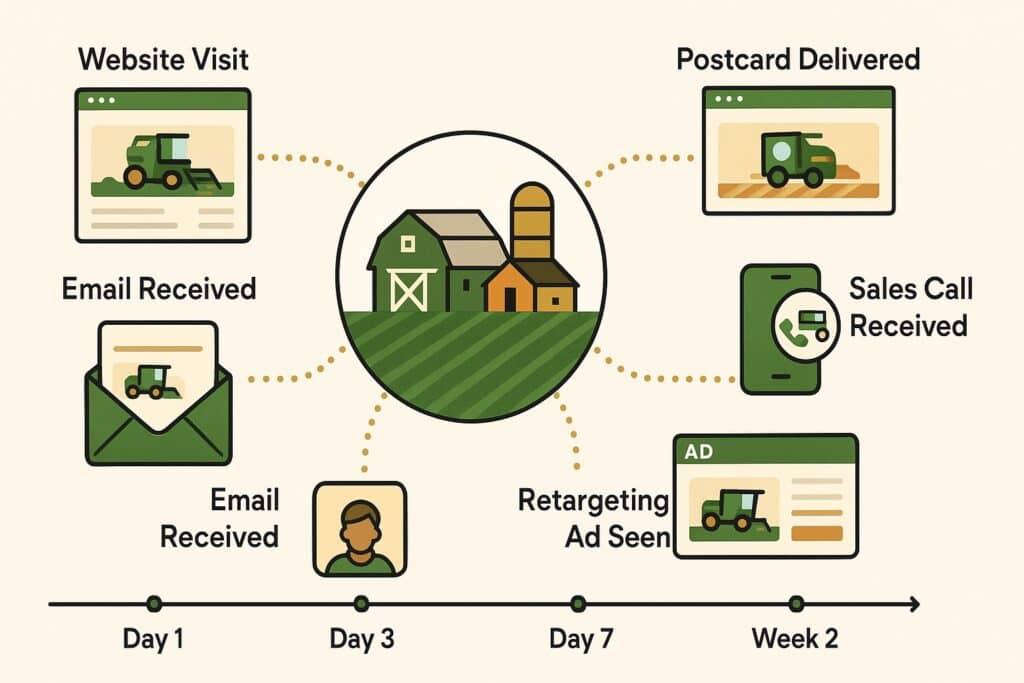 Imagine this scenario: A farmer browses your tractor inventory online on Tuesday. On Friday, they receive a postcard at their farm featuring those exact models with an invitation to schedule a test drive and a personal note from your sales team.